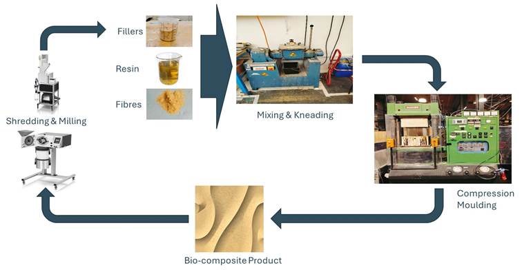 Using Bulk Moulding Compound (BMC) technology, the project combines lignin-based resin, lignocellulosic fillers, and fibres into a mouldable dough. When pressed at 140–160°C and 70–90 bar, the material cures into strong composite panels suitable for demanding end-use applications.